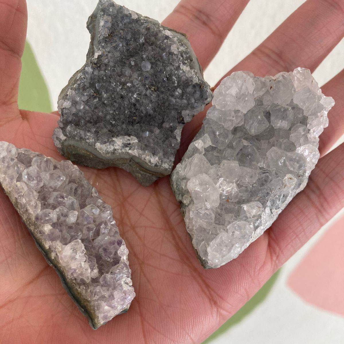 Drusa de amatista en bruto, todos pesan entre 20gr -25gr y miden alrededor de 5 cm. LAS DRUSAS TIENE UN COSTO BORMAL DE $50 MXN SON MEDIANAS LAS QUE ADQUIRIRAS AL ELEGIR ESTE ARTICULO SON MÁS PEQUEÑAS POR LO QUE SU PRECIO ES DE $30 MXN *En minerales en bruto las piezas pueden variar en tamaño, forma y peso ya que ningún mineral es exactamente igual a otro.
