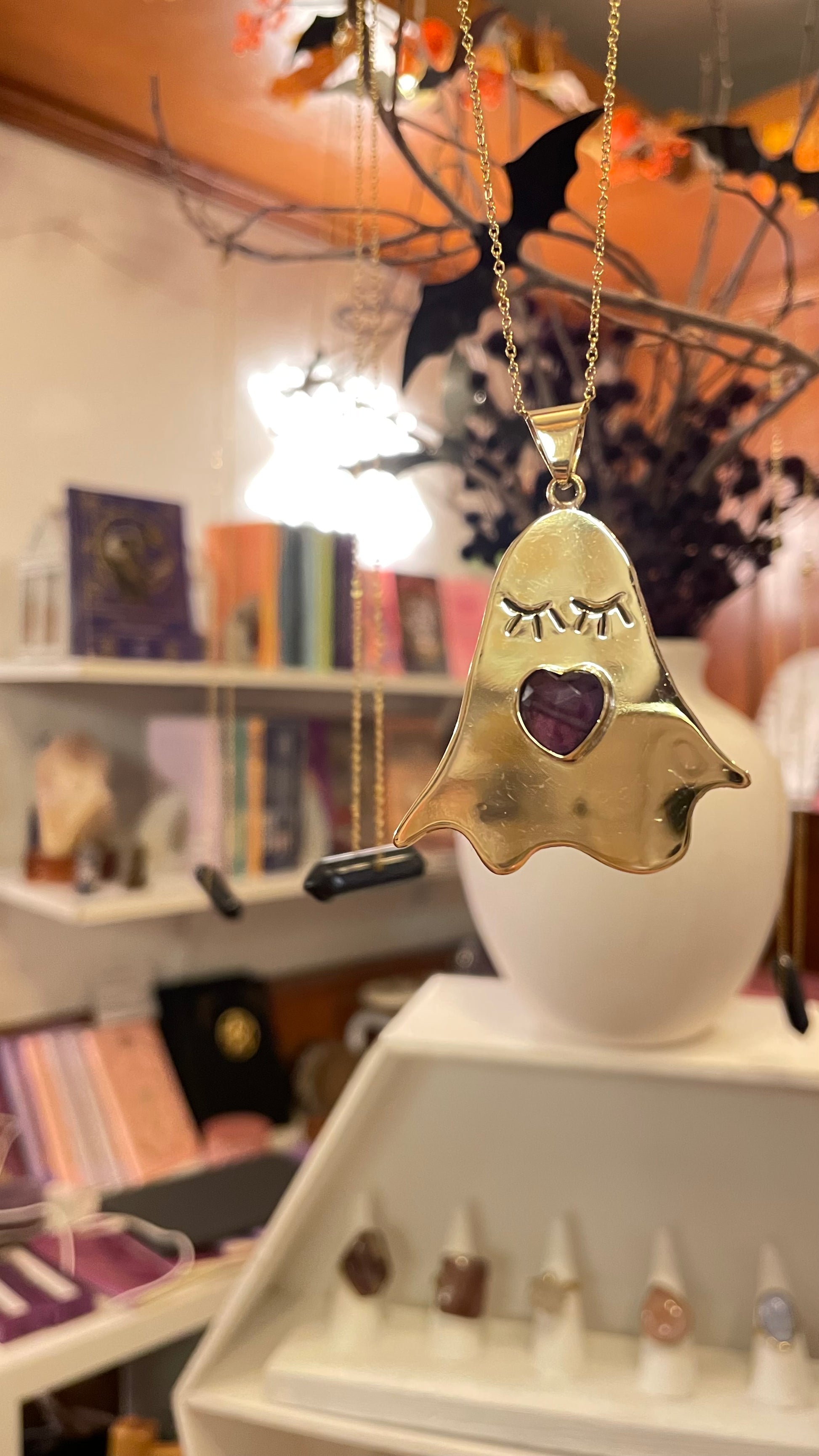 Collar simbólico de espíritu, montado completamente a mano con un corazón de amatista de Uruguay facetada.