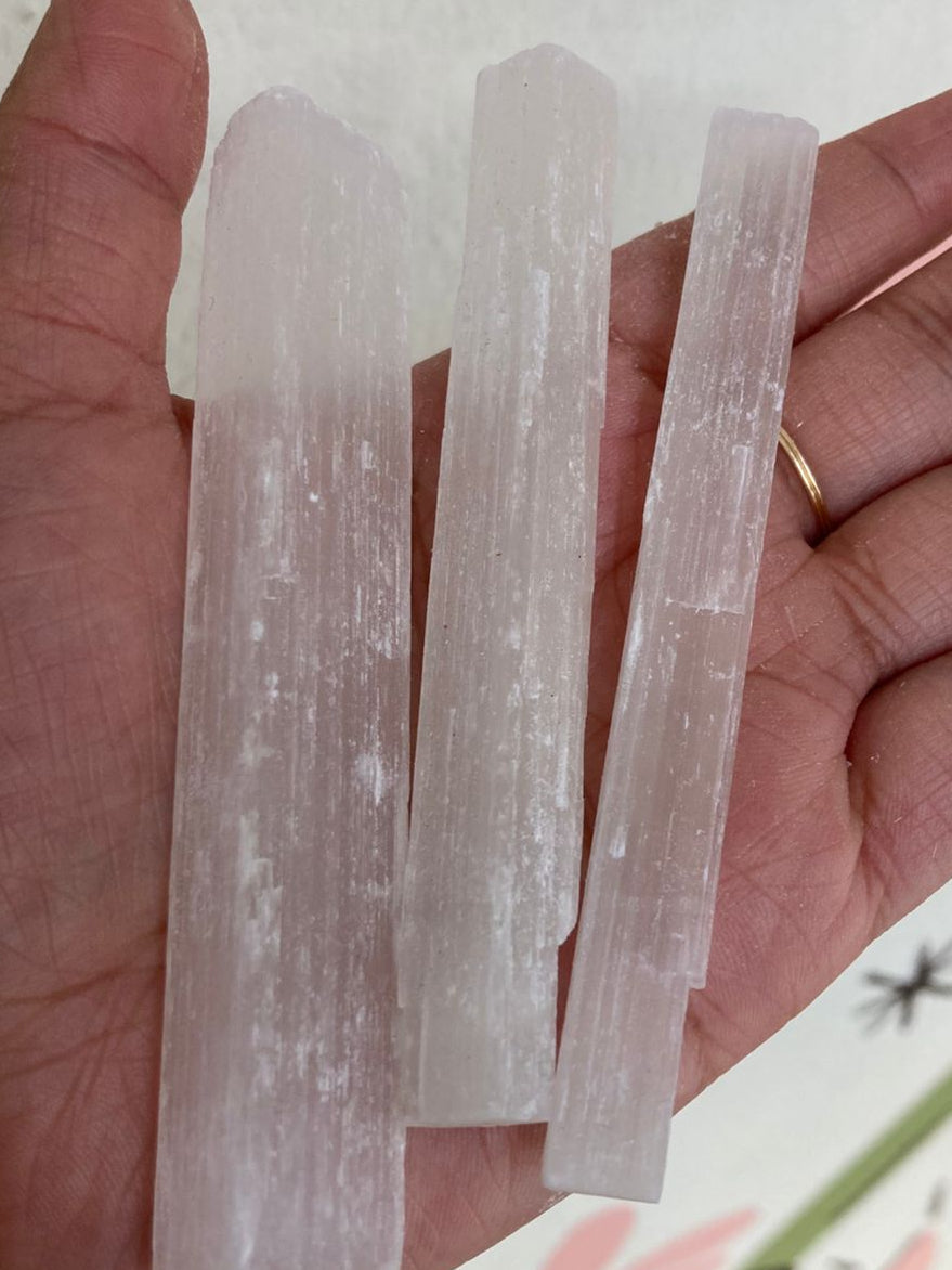 Pieza pequeña selenita en bruto. Pieza de mesa, colección o altar. Todas pesan entre 30 gr- 50 gr y miden alrededor de 3cm a 5cm. *En minerales en bruto las piezas varían en tamaño, forma peso ya que ningún mineral es exactamente igual a otro.